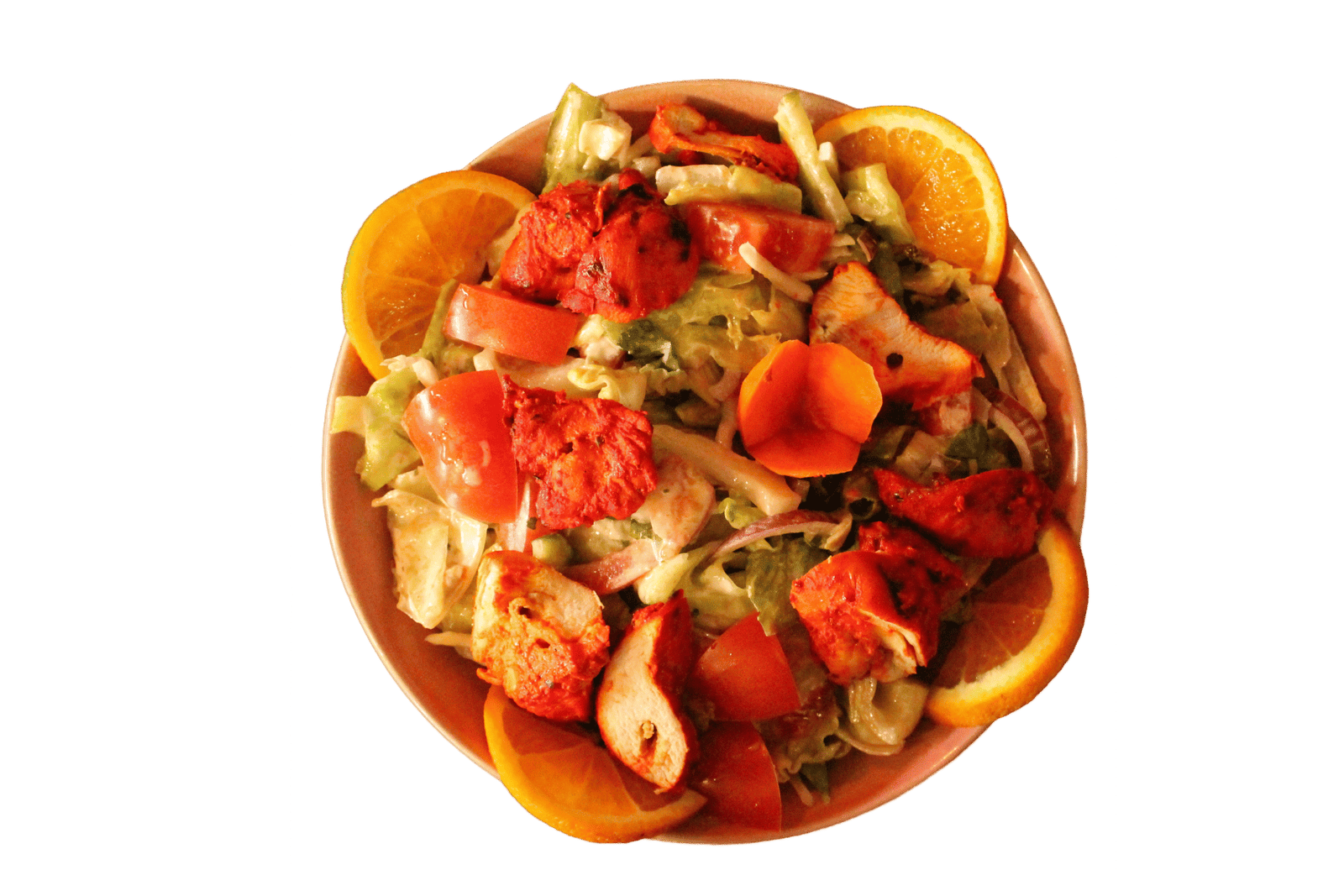 Juicy chicken tikka pieces atop a bed of mixed salad greens, onions, and tomatoes — balanced with a cooling herb dressing.