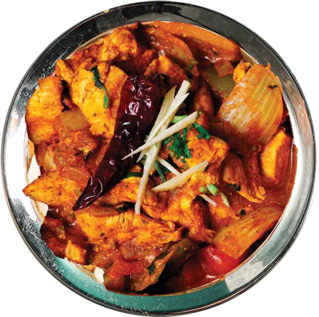 A stir-fried curry with julienned peppers, onions, and a tangy tomato base — medium-spiced and vibrant.