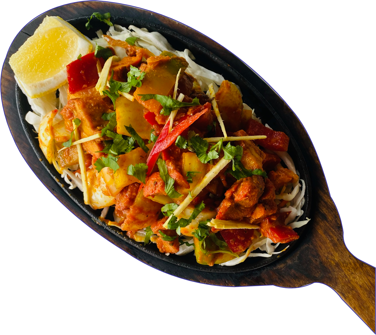 Tender lamb cubes tossed in robust tandoori masala, then brought to the table sizzling alongside smoky vegetables and herbed butter.
