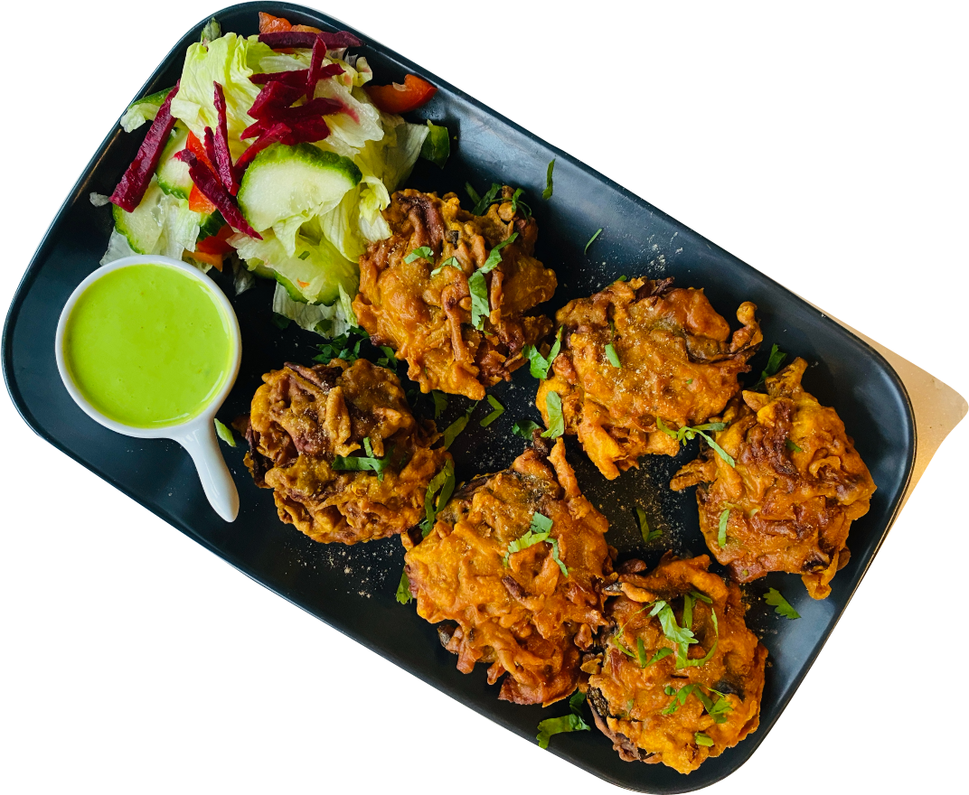 Assorted veggies dipped in chickpea batter and fried until crisp, served with mint dip.