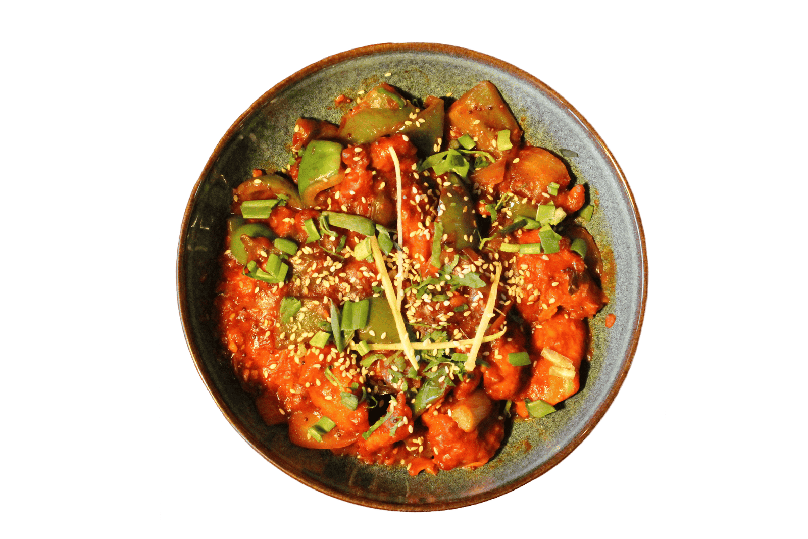 Crispy chicken sautéed in a tangy soy-chili sauce with onions and bell peppers.