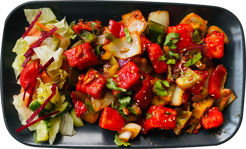 Paneer stir-fried in a fragrant Asian-style chili-garlic sauce with spring onions and sesame.