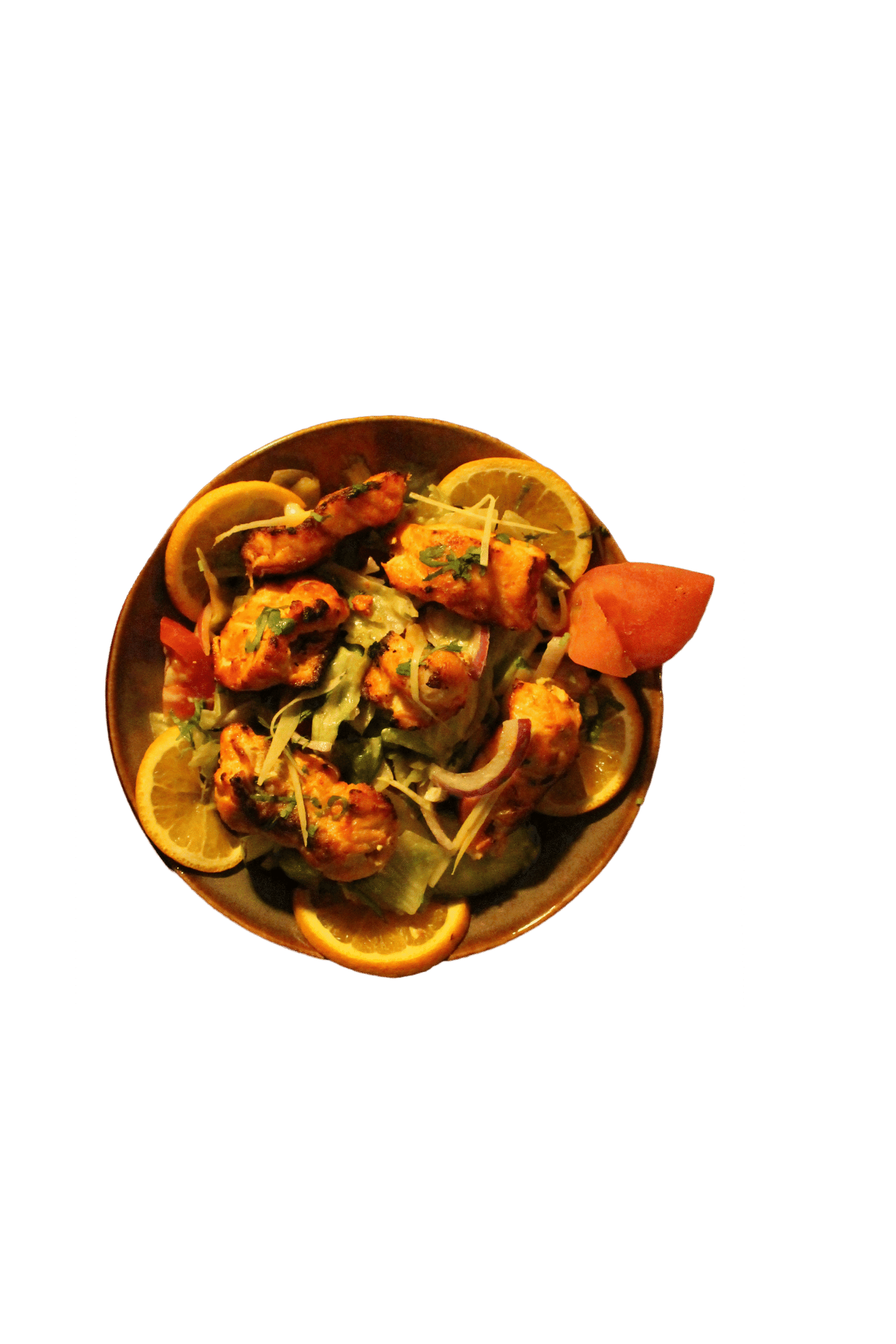 Grilled salmon tikka pieces served over a bed of crisp greens, tossed with onions, cucumbers, and a zesty mint-yogurt dressing — a perfect fusion of health and flavor.