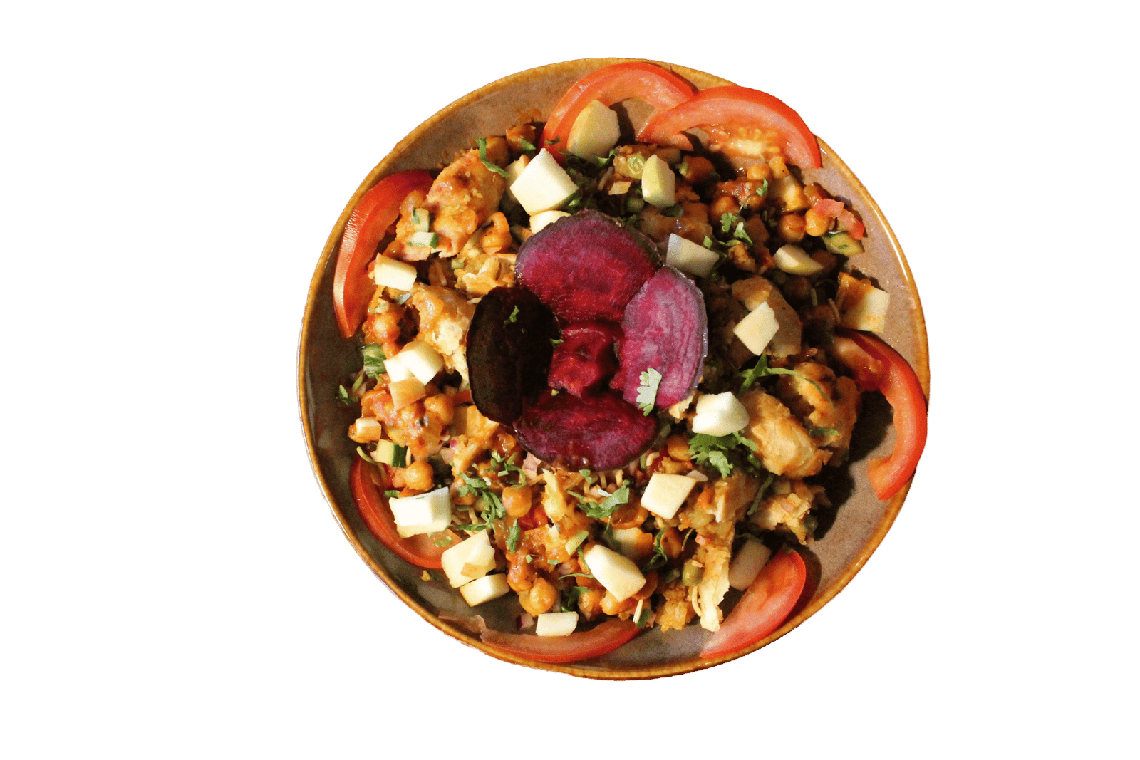 Crushed samosas topped with chickpeas, yogurt, tangy chutneys, and fresh coriander.