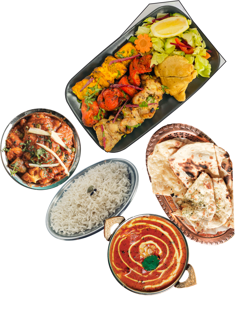 Starters/ Starters: Chicken Tikka, Paneer Tikka, Veg Samosa, Veg Platter Selection Main course/ Main course, Rice and Basket of Mixed Naan Bread