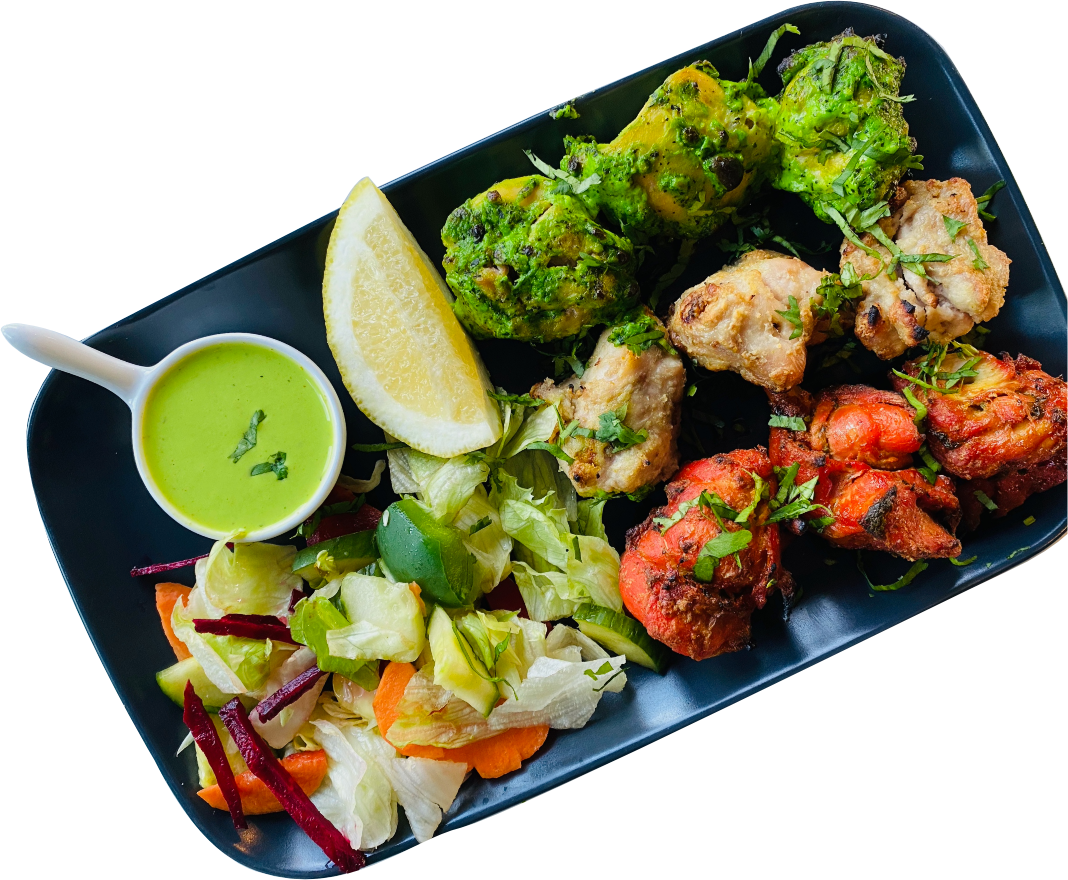 Tri-colour platter of haryali, malai, and lal (red) tikka—three flavours on one skewer.