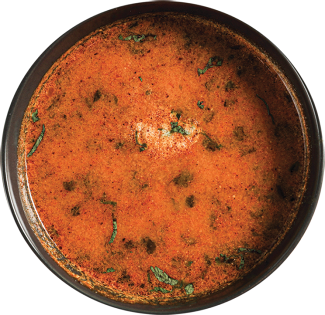 A spiced Indian-style tomato broth, slow-simmered with cumin, ginger, and fresh coriander — tangy, warming, and full of traditional flavor.